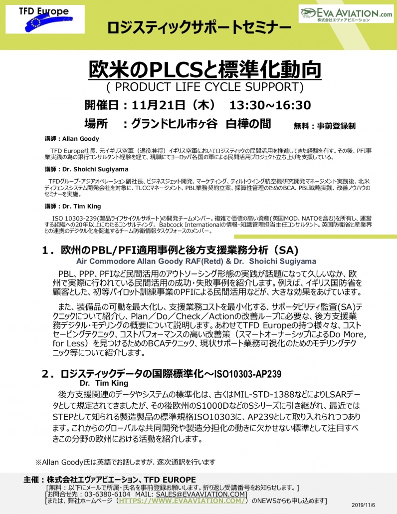 2019年11月21日(木)グランドヒル市ヶ谷(白樺の間)にて、英国TFD社のプレゼンテーション『欧米のPLCSと標準化動向』を行いました。お忙しい中、ご来場いただいた方々には御礼申し上げます。
