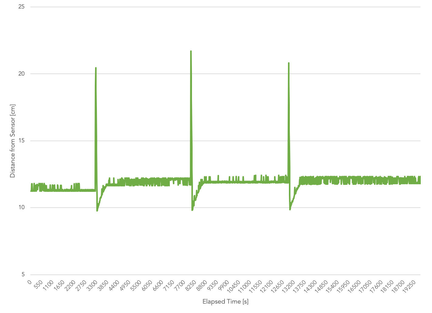 • グラフの値はセンサからの距離であることに注意。距離が大きくなるとタンクは排水を行なっており、小さくなると給水している。