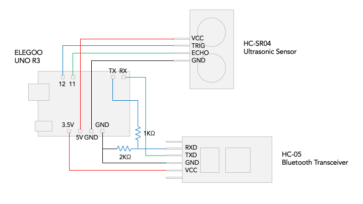 まず、Amazonなどで次の2つの部品を購入し、これらを利用して次のような回路を作成した。HC-05のRXDは3.3V、UNO R3のTXは5Vであるため、Voltage Dividerを挟んで減圧している。