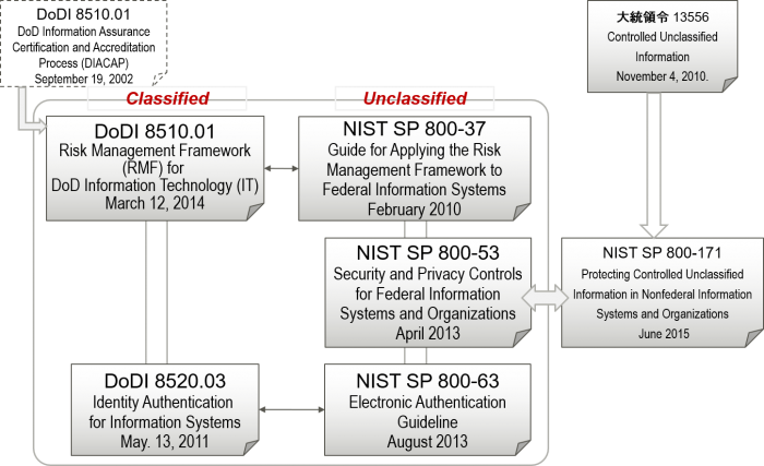 この度の要件は、米国の政府調達(特にDoD)について関係する下請け企業すべてに対して遵守を要求するものです。本件のDoDおよびNISTの規定体系をひとことで整理すると、すべての連邦政府が関わる重要情報(Unclassified)についてはNISTが規定し(SP800-37 RMF)、軍事秘密などの情報(Classified)を加えた体系をDoDが規定しています(DoDI 8510.01 RMF)。その中で、CUIの扱いに関するドキュメントは下図のようになっています。
