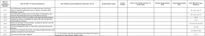これらは、使用するシステム要件に関するものと、組織運用規則で対応するものに分けることができます。従って、このセキュリティ管理項目に対応するには、NISTの要件を満たすコンピュータシステム(サーバー、ネットワーク、PC、認証など)を構築し、その運用にあたる適切な規則を決めることとなります。なお、要件を満たせない場合は、満たすための方策と期日を示すことが必要です。