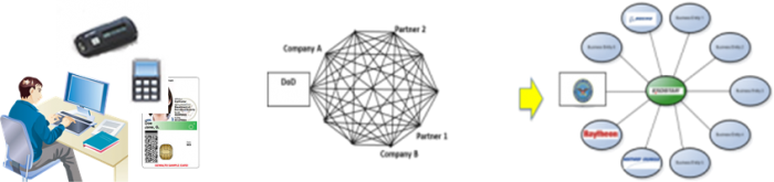 航空防衛業界に対しては、Lockheed Martin, Boeing, Raytheon, BAE Systems, Rolls-Royceという主要5社により2000年に設立されたEXOSTAR社がMAG(Managed Access Gateway for Aerospace and Defense)と呼ぶサービスを提供しています。業界で共通に通用する「アイデンティティ認証」を行い、各社の提供するアプリケーションへの入口をIdentity Hubによって制御しています。