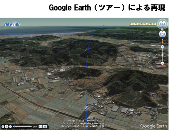 また、KML形式のデータを出力できるので、GoogleEarthにより実際のフライトを三次元ビジュアルに再現することも出来ます。